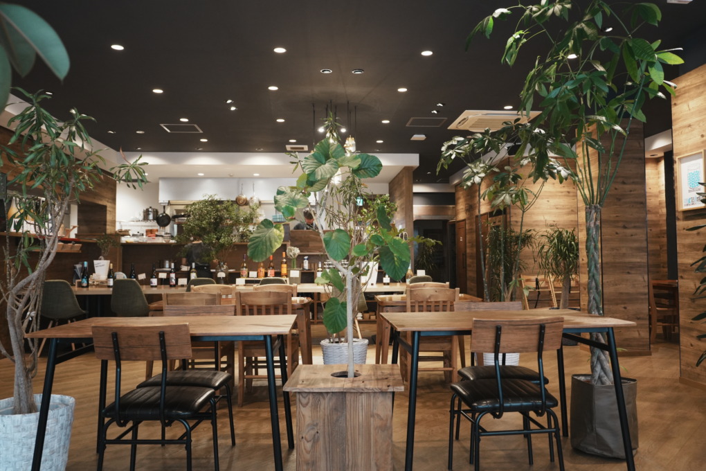 店内に入ると、まず目を引くのは大きな観葉植物と木目のインテリア。ナチュラルウッドを基調とした温かみのある空間で、まるで森の中にいるような心地よさがあります。