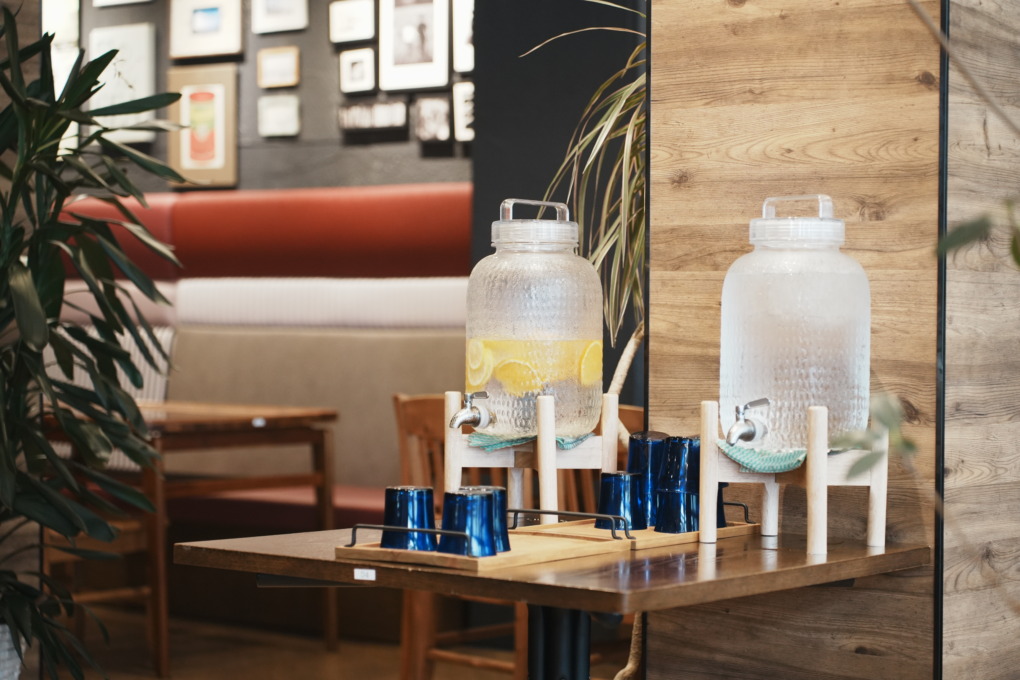 セルフのオレンジ水や普通のお水も設置されていて、細部まで居心地の良さにこだわりを感じます。