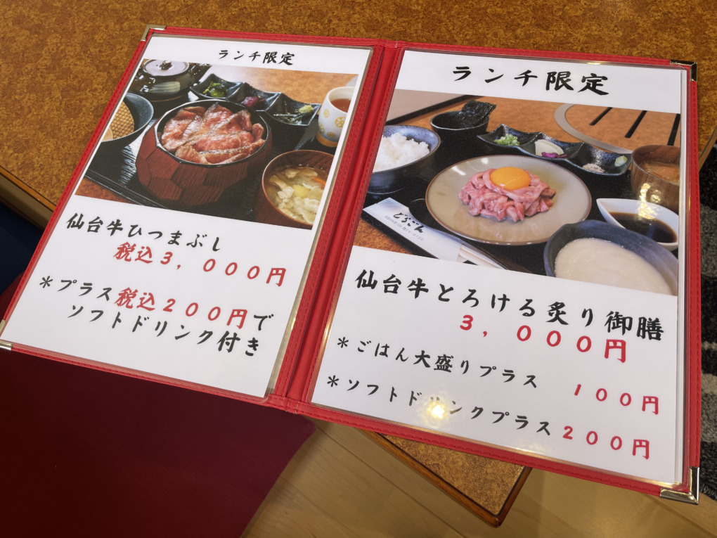 今回は「仙台牛とろける炙り御膳」を頂きましたが、他にも魅力的なランチメニューが用意されていました。