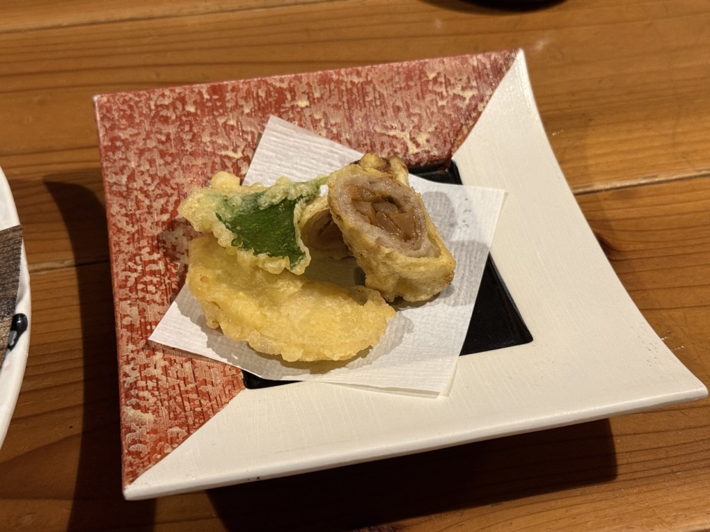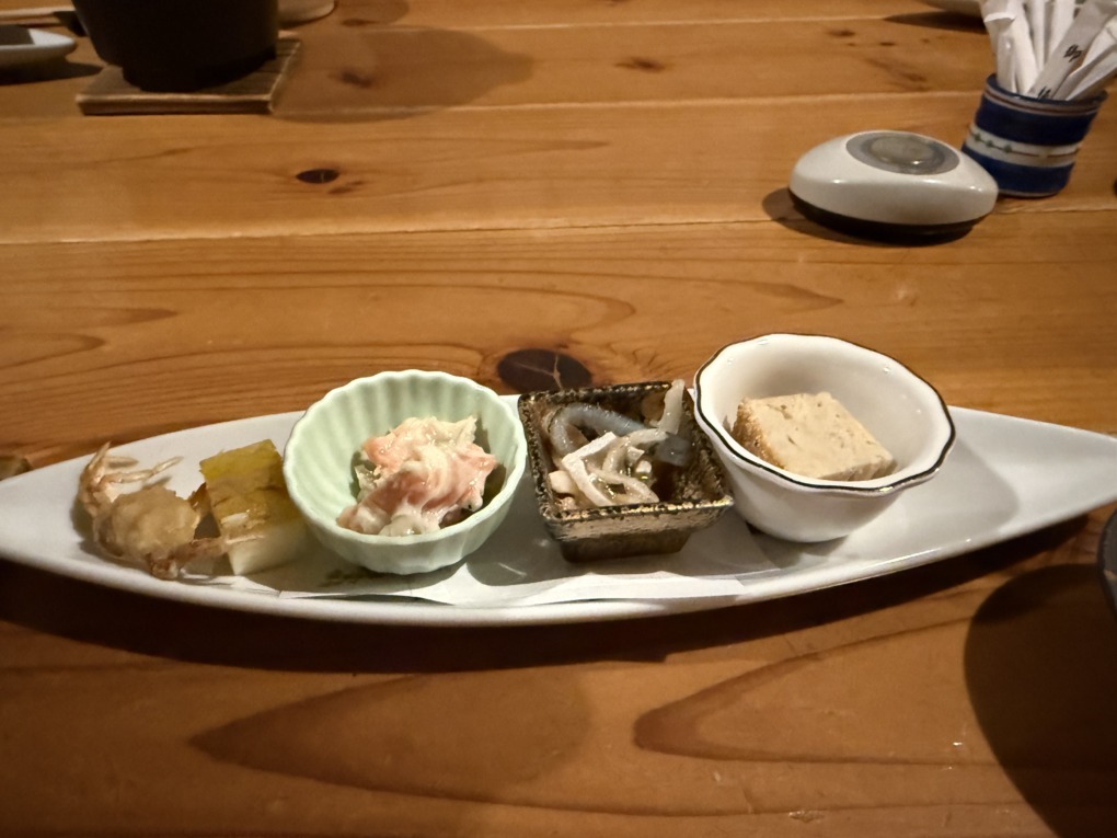 まず卓上に並んでいたのは、味わいの異なる小鉢がいくつか。和の前菜らしい上品な盛り付けで、一口ごとに味の方向性が変わるため自然とお酒が進みます。