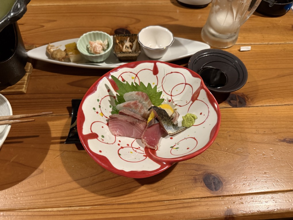 ほどなくしてお刺身の盛り合わせ。透明感のある白身や艶のある切り身が美しく並び、口に含むと弾力と鮮度の良さを実感。さっぱりしたもの、脂がのったものとバランスが良く、最初の山場として満足感が高い一皿でした。