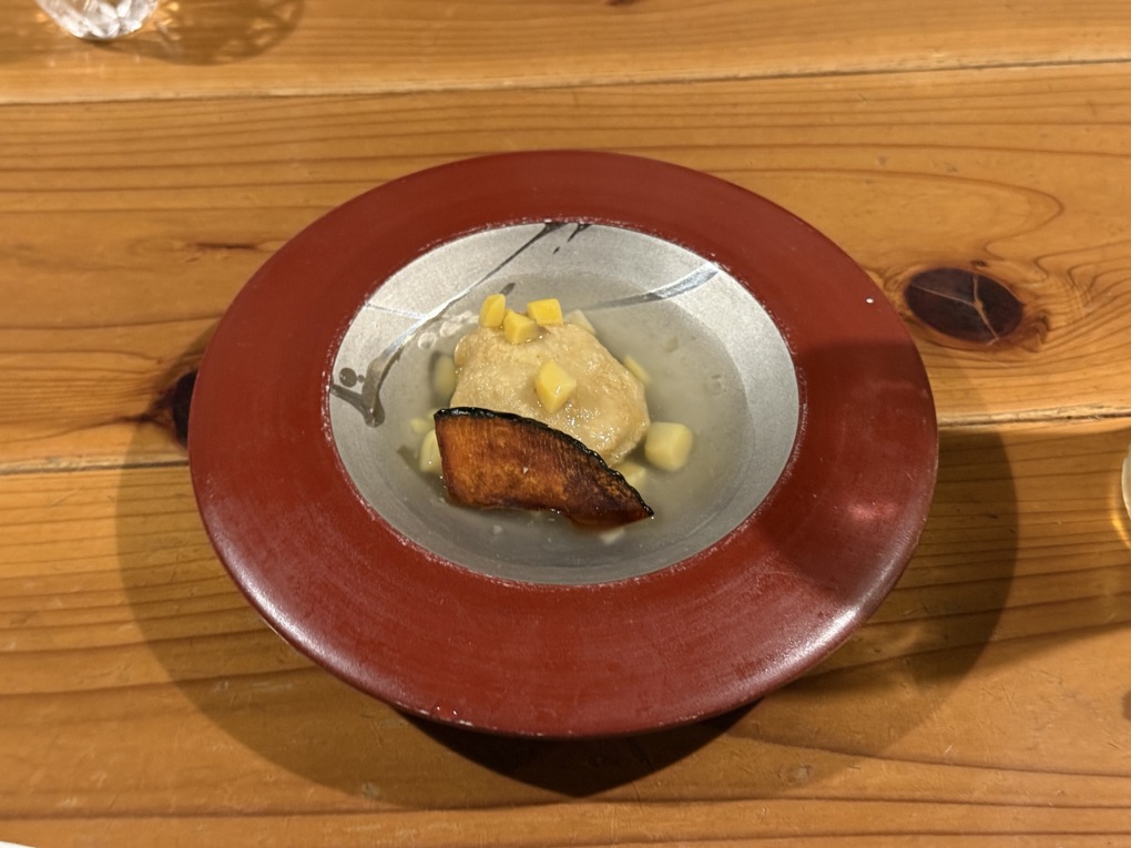 箸休めにはやわらかな味付けの煮物。出汁が穏やかで、口の中を一度ニュートラルに戻してくれる役割。コース全体の抑揚づけが巧みだと感じました。