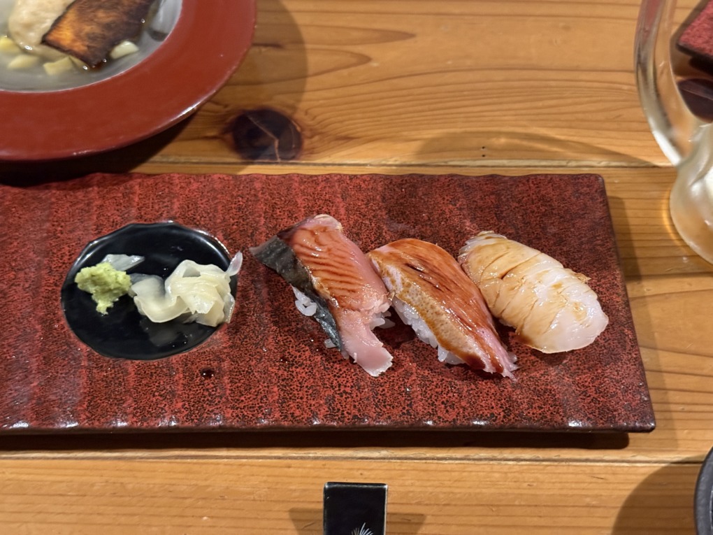 終盤は寿司の盛り合わせで締め。炙りの香ばしさが際立つもの、弾力のある白身の握りなど、見た目にもきれいな構成。