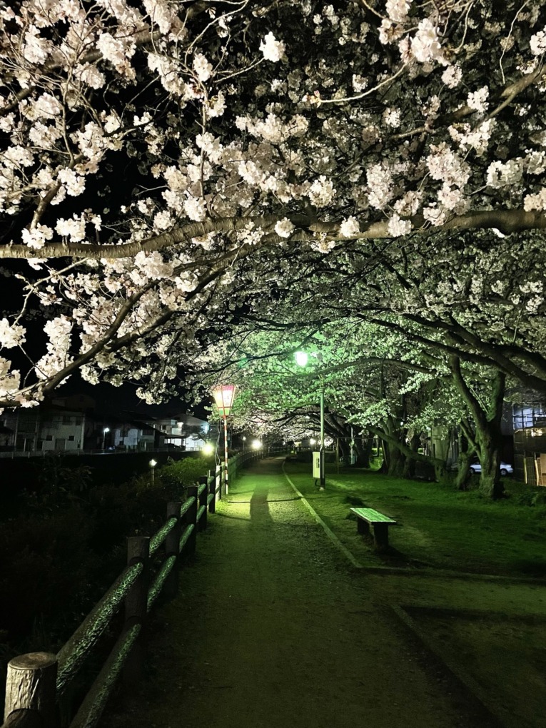 夜になるとボンボリが点灯し、水面にピンク色の光が溶け出す光景は、袋川ならではの楽しみ。ところどころにベンチが設置されているので、仕事帰りにコンビニでお茶を買い、ぼーっと夜桜を眺めるのもおすすめです。