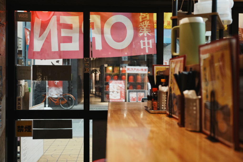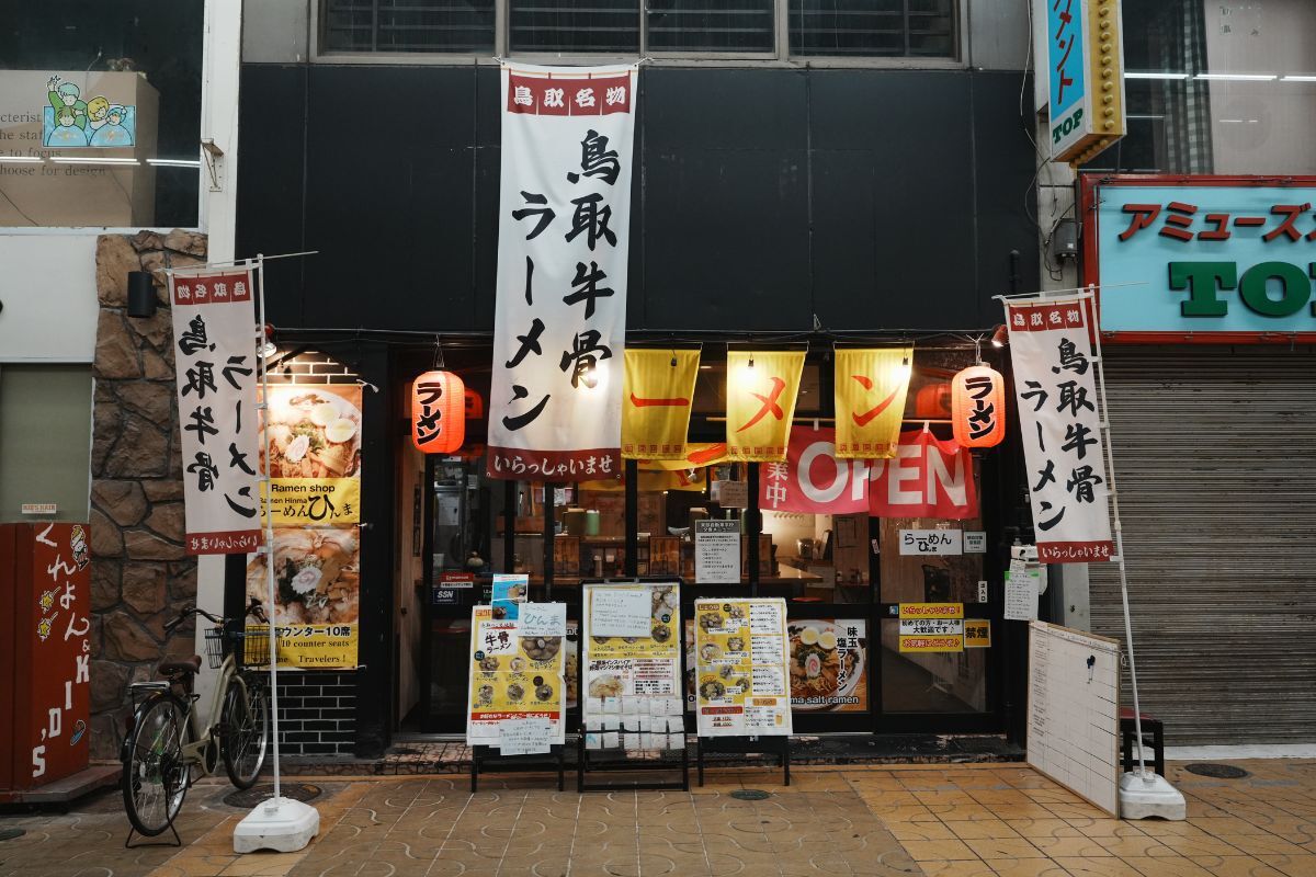 店前には「牛骨ラーメン」ののぼり旗が立ち、黄色い暖簾と赤提灯が目印。商店街を歩いていれば自然と視界に入ってくる存在感があり、「鳥取名物を食べたい!」という時にすぐ見つけられるわかりやすさがあります。