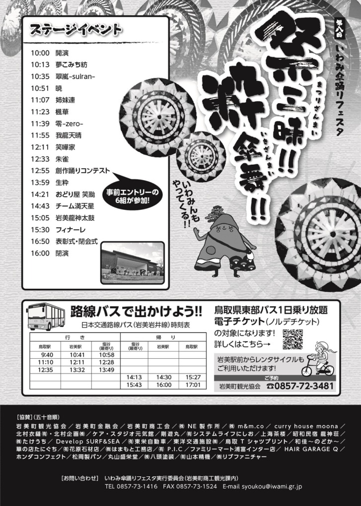 「いわみ傘踊りフェスタ」とは、岩美町内に古くから受け継がれている傘踊りや太鼓などの伝統芸能を、現在のしゃんしゃん傘踊りなどと融合させて町内外に発信し、伝統文化を伝えるイベント。