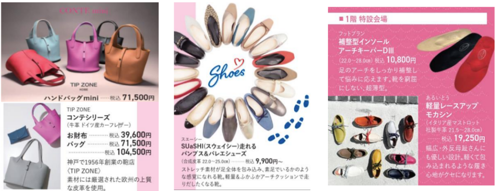グルメのほか、レザーブランド「TIP ZONE(チップゾーン)」のハンドバッグやお財布、「スエーシー」の走れるパンプス&バレエシューズなど、クリスマスプレゼントにもぴったりなアイテムも販売👜🎄