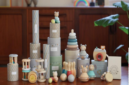 木製おもちゃやベビー・キッズ向けアイテムを展開おり、お部屋に散らばっていても可愛く見えるような、優しい色合いが特徴です。