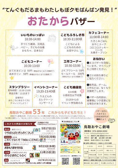 とりぎん文化会館にて、「だるまもてんぐもわたしもぼクモばんばン発見!おたからバザー」が開催されます。