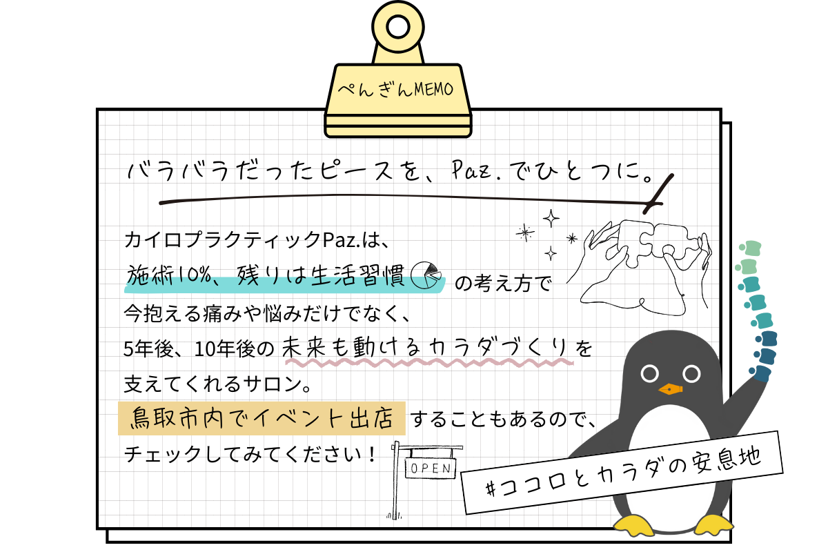 更新日:2026.02.03鳥取県で施術を行う「カイロプラクティック Paz.(パズ)」は、生活そのものを見直すことを大切にしているカイロプラクティックです。